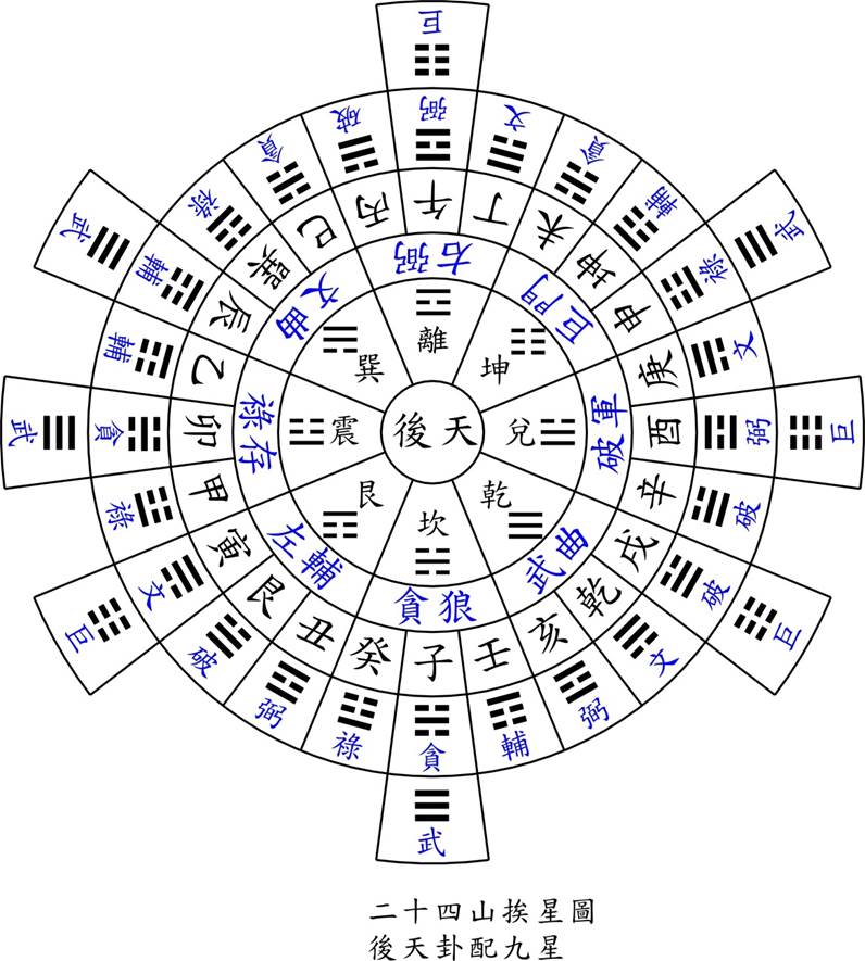 Lục thập tứ quái của Đại quái phái, tức là đem tiên thiên 64 quái phối trên 24 sơn, bát quái thủ tượng, đoán dịch 64 quái tự cung ngũ hành, mỗi quái chiếm ước 5,6 độ, tuân theo lý luận của Đại quái phái, lại đem mỗi quái này phân làm 6 (tượng của lục hào) tức một vòng sẽ phân thành 384 hào để có cát hung khác nhau.